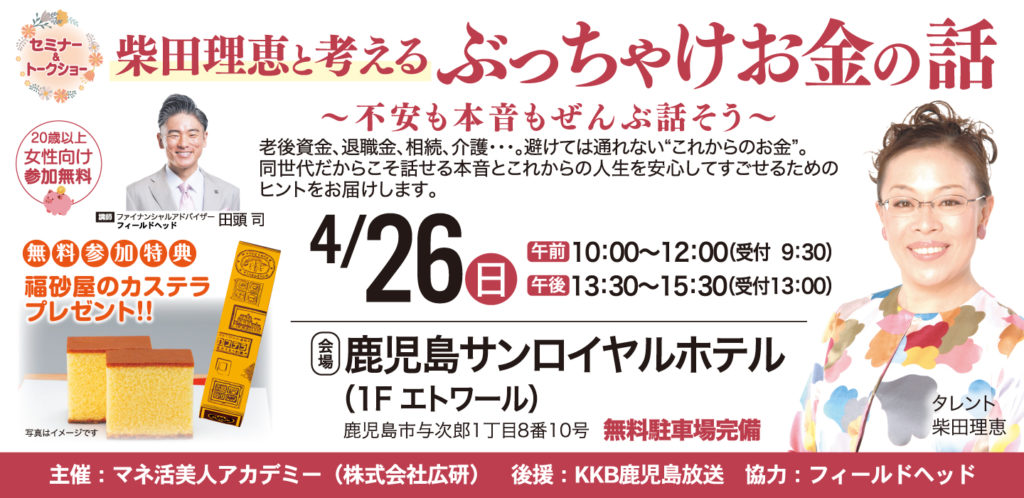 スザンヌさんを特別ゲストにお迎えしたセミナー&トークショーが各地で大盛況ですが、第二弾として、柴田理恵さんを特別ゲストにお迎えしたセミナー&トークショーを鹿児島で開催いたします。お金について、笑って考えましょう!