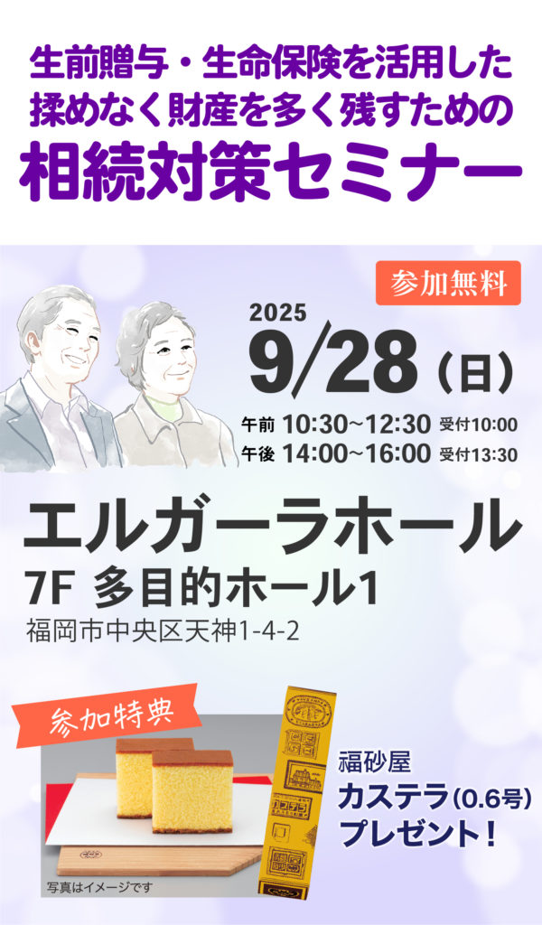 9/28(日) 福岡 生前贈与・生命保険を活用した、揉めなく財産を多く残すための 相続対策セミナー